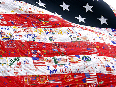 25' X 30' flag painted by Williamsville NY elementary school students, hung at Buffalo Bisons Dunn Tire Park for Flag Day, Buffalo, NY, June 16, 2002/ Marion Faller.