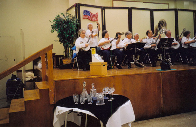 Prize display and entertainment at the Sacramento archdiocese "Women of the Year" awards ceremony, March 2002/Sally Stein.