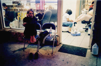 In front of a nail spa afer dusk, LA, CA., 2001/Sally Stein.
